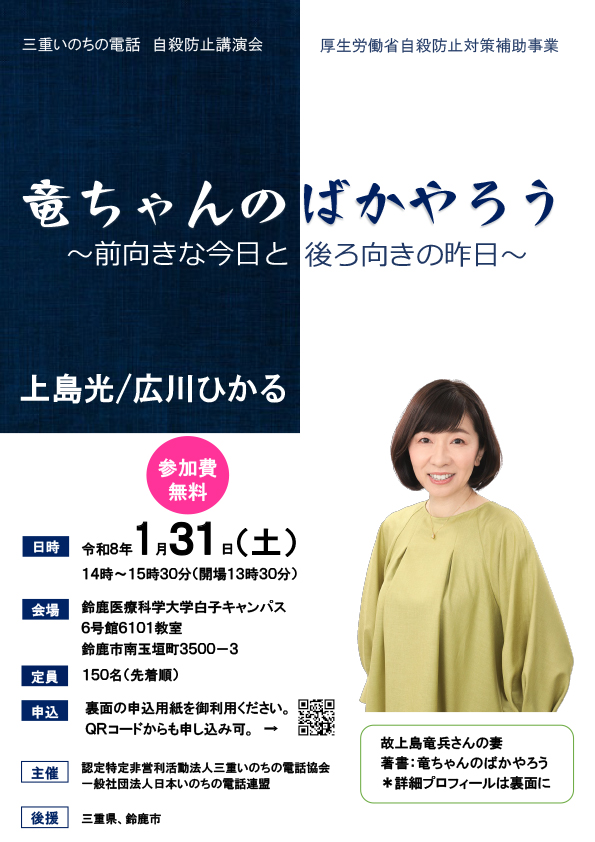 日時 令和8年1月31日(土)14時~15時30分(受付13時30分) 会場 鈴鹿医療科学大学白子キャンパス6号館6101教室 (鈴鹿市南玉垣町3500-3) テーマ 「竜ちゃんのばかやろう~前向きな今日と後ろ向きの昨日~」 講師 広川ひかる氏 自殺防止... -
